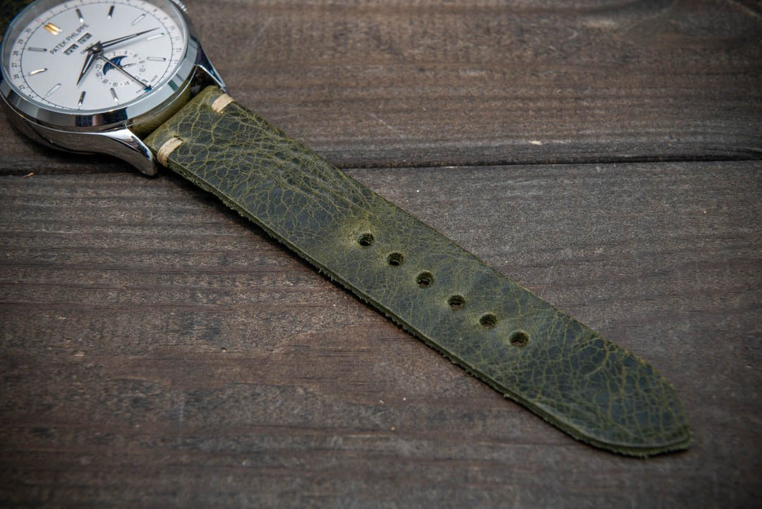 Das Uhrenarmband ist aus feinstem Badalassi Carlo Leder aus Italien gefertigt. Das Uhrenarmband hat einen einzigartigen rustikalen Look und eine tiefe Farbe. Das Leder bekommt mit der Zeit eine schöne Patina. Farbe: Oliva, Pull-Up.