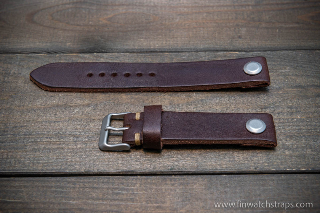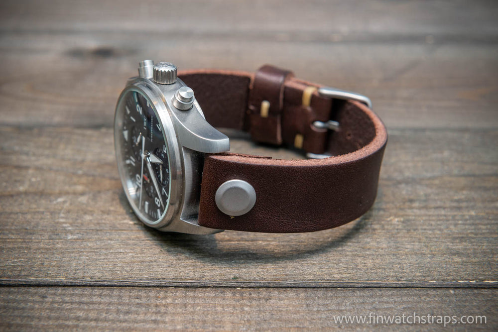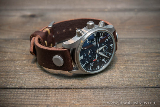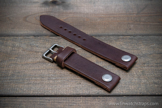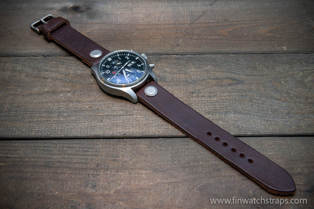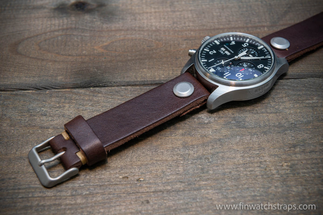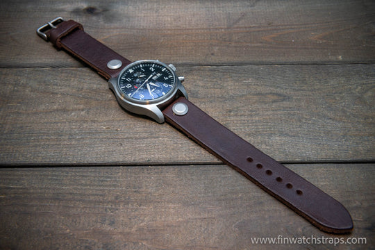 Das Uhrenarmband ist aus dickem (3,5-4,2 mm) italienischem Bullenleder gefertigt. Das Uhrenarmband hat ein einzigartiges Aussehen und eine tiefe Farbe. Das Leder bekommt mit der Zeit eine schöne Patina. Das Armband ist sehr weich und braucht keine Zeit, um sich an Ihr Handgelenk zu gewöhnen. Es wird sich vom ersten Tag an, an dem Sie es tragen, äußerst bequem anfühlen. Aufgrund der Beschaffenheit des Leders sind leichte Dickenabweichungen möglich. Perfekt für große und schwere Uhren.