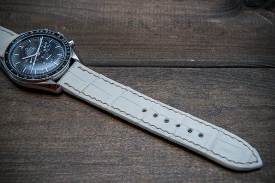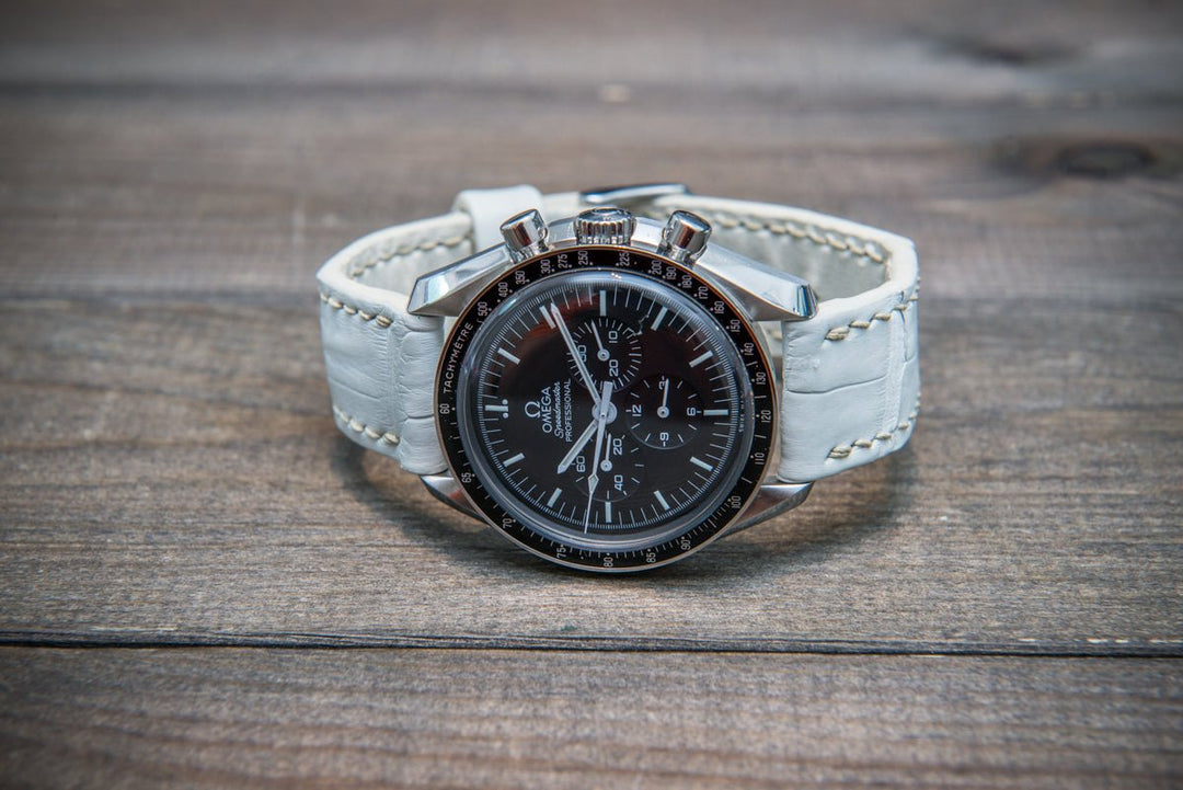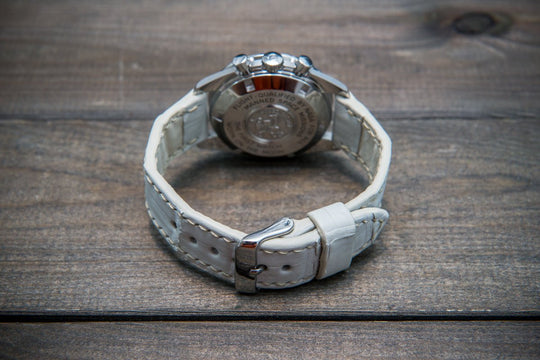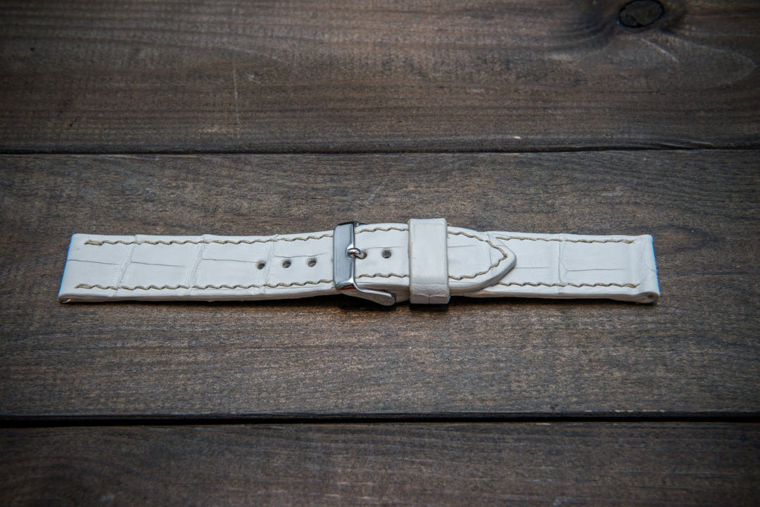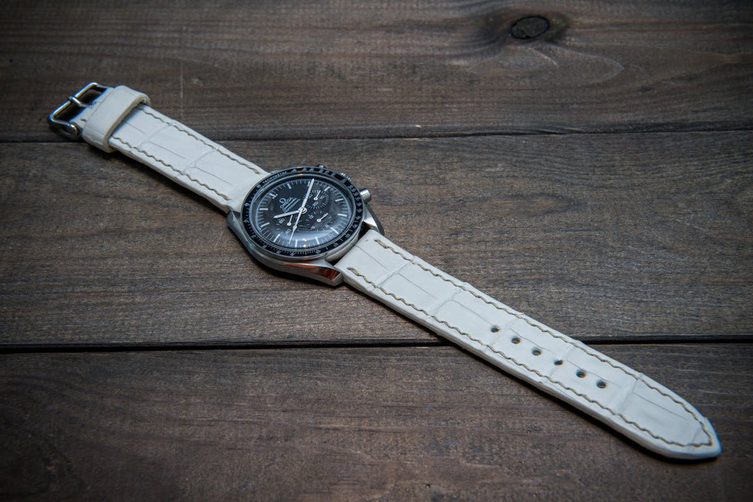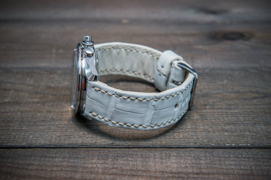 A handmade genuine alligator leather watch strap is made to the highest standards. Natural white color.