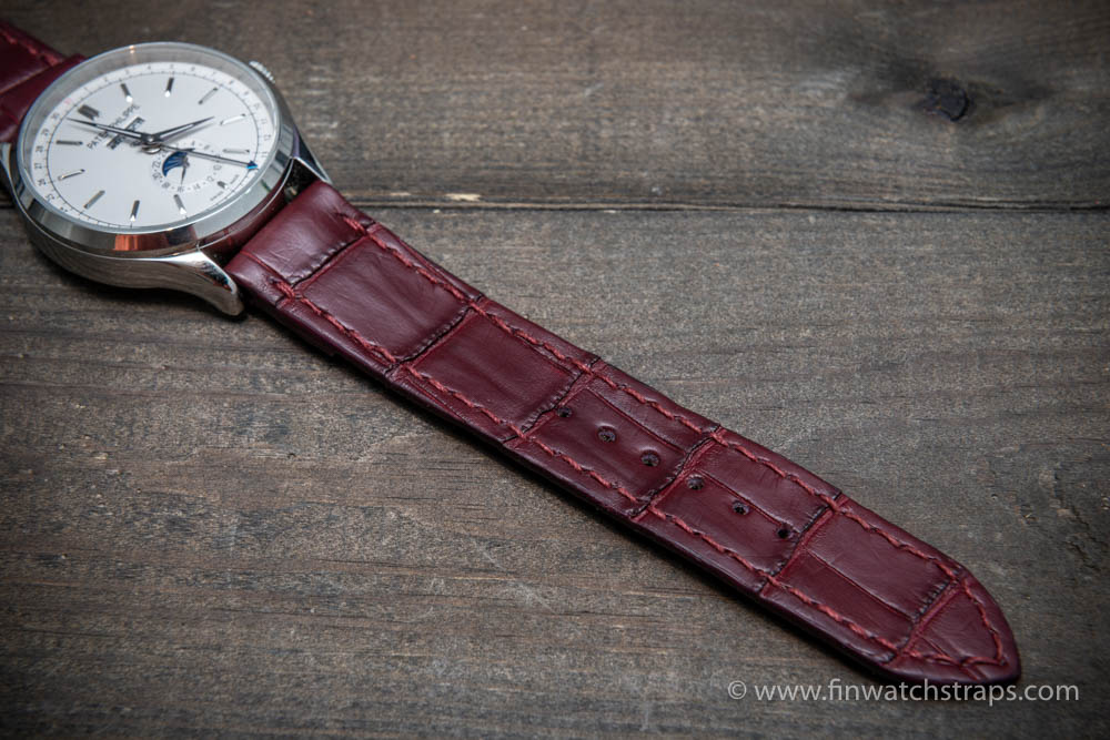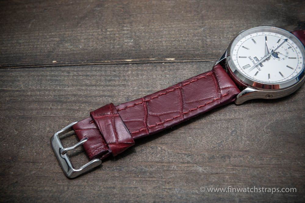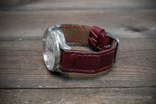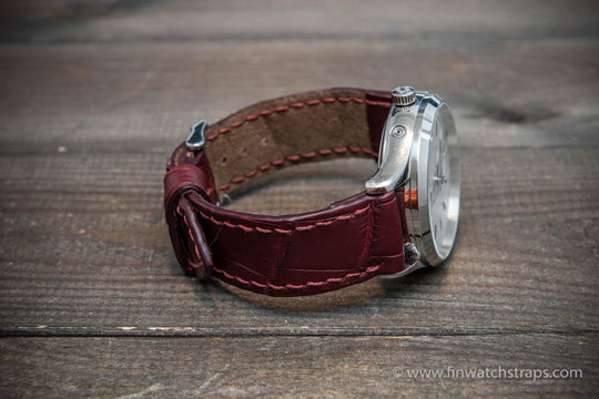 A handmade genuine alligator leather watch strap is made to the highest standard. Burgundy matte color.