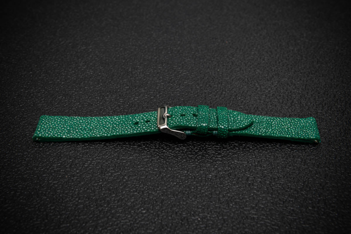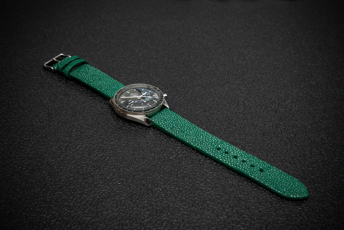 Portate al vostro polso un audace tocco di colore con il cinturino in pelle di razza verde smeraldo. Nota per la sua caratteristica superficie a ciottoli e per la sua naturale lucentezza, la pelle di razza è uno dei materiali più resistenti ed eleganti per i cinturini di lusso.