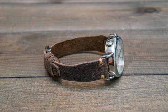 Stone Monaux suede (Charles F. Stead tannery, the UK) leather watch strap, Handmade in Finland. The sample is stitched with Olive thread color. Feel free to customize it with the best matching watch thread color.